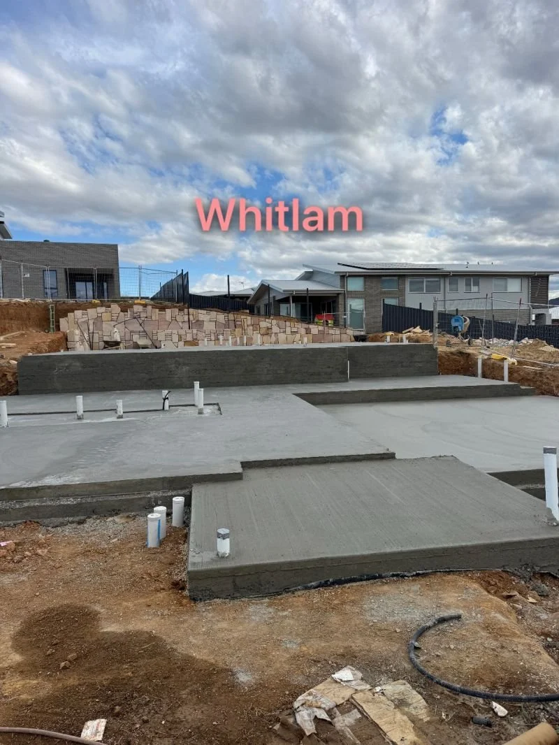 The Whitlam property needed to be dug deep and have the exact base work done to provide stable building levels at various levels. We poured concrete in massive slabs at varying heights, as seen in the construction photos, critically planning the level so that it fit with the rising terrain. The white PVC pipes that stick out of the concrete suggest strategic positioning of the plumbing and drainage systems that are specially made to suit the sloped areas.